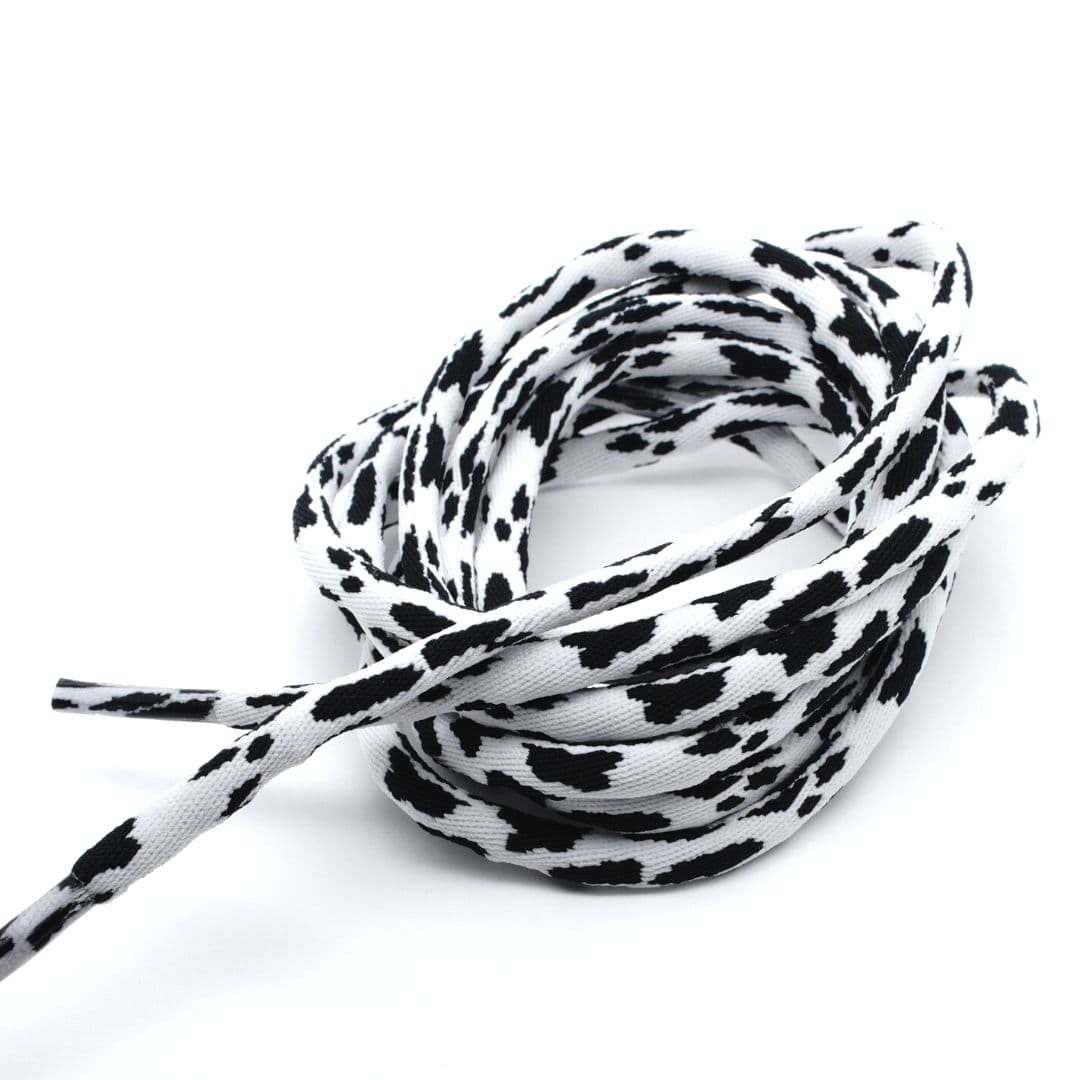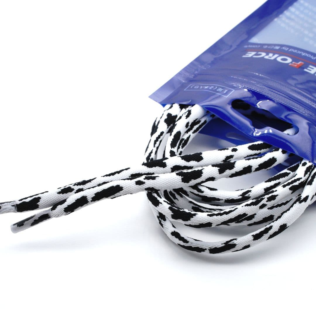 【LACE FORCE】アニマル柄シューレースは、個性的なデザインが特徴のアイテムです。牛を模したブラックとホワイトのカウカウ柄と、シマウマを模したブラックとホワイトのゼブラ柄の2種類が用意されています。これらのアニマル柄シューレースは、あなたのスニーカーにユニークなアクセントを加えることができます。